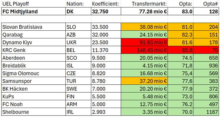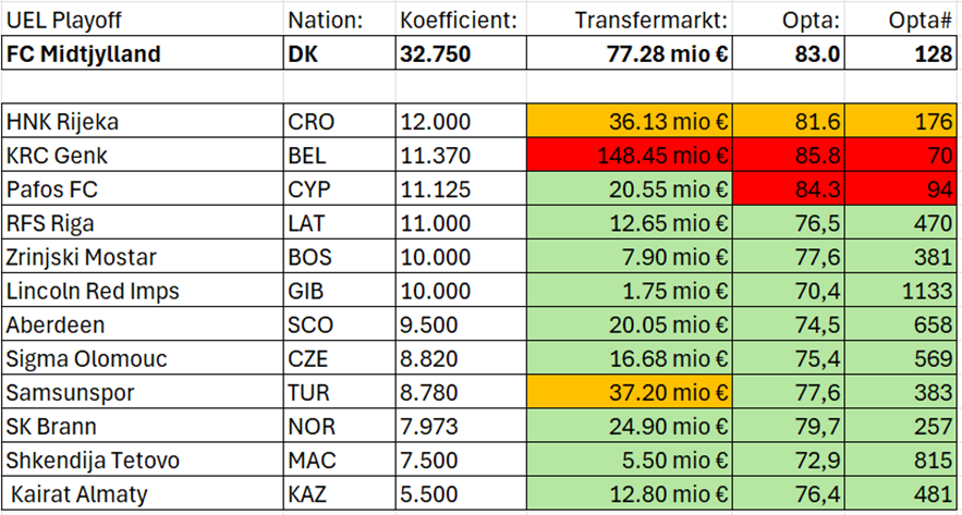 Her er der særligt én modstander, som Midtjylland skal håbe på at undgå, når lodtrækningen finder sted. Belgiske Genk er med afstand det stærkeste mandskab blandt de useedede mandskaber, mens taberen af Champions League Q3 opgøret mellem Pafos og Dynamo Kiyv, heller ikke behøver at komme op ad bowlen. Af ønskelodtrækninger kan de midtjyske fans i stedet håbe på Lincoln Red Imps fra Gibraltar eller Shkendija Tetovo fra Makedonien.