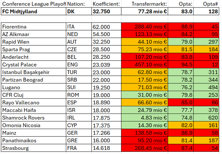 Det kan – på godt jysk – gå hen og blive noget rigtig møg for Midtjylland, hvis man ryger ud af Europa League. FA-Cup vinderne fra Crystal Palace, 2x Conference League finalisterne fra Fiorentina, og Bo Henriksens Mainz, samt Strasbourg er skrækmodstanderne, mens Shamrock Rovers eller Macabbi Haifa vil være ønskemodstanderne. FC Midtjylland kan ikke trække Jagiellonia Białystok, grundet Silkeborgs møde med polakkerne i Q3.